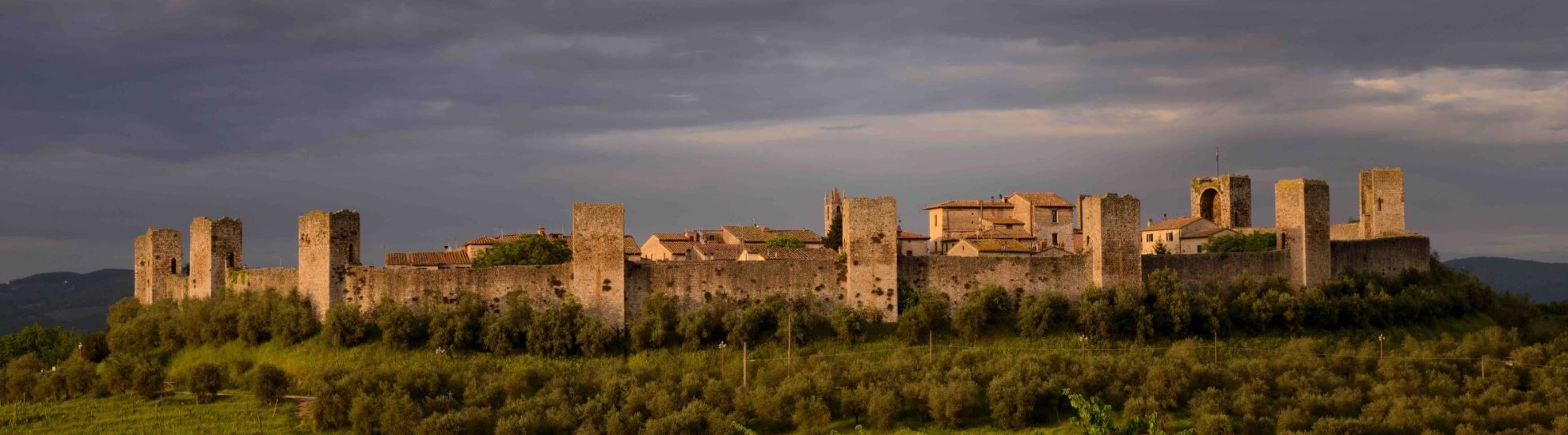 En vue de Monteriggioni, à dix minutes en voiture de Sienne. Si vous arrivez du nord de l’Europe, rejoignez Florence par autoroute: prenez la direction de Rome et quittez l’autoroute à la sortie « Firenze Certosa ».